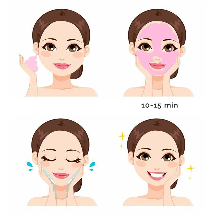 Apply to clean skin and leave on for 10-15 minutes. remove with water. follow with rose facial mist and/or facial oil (Argan + Vitamin E).