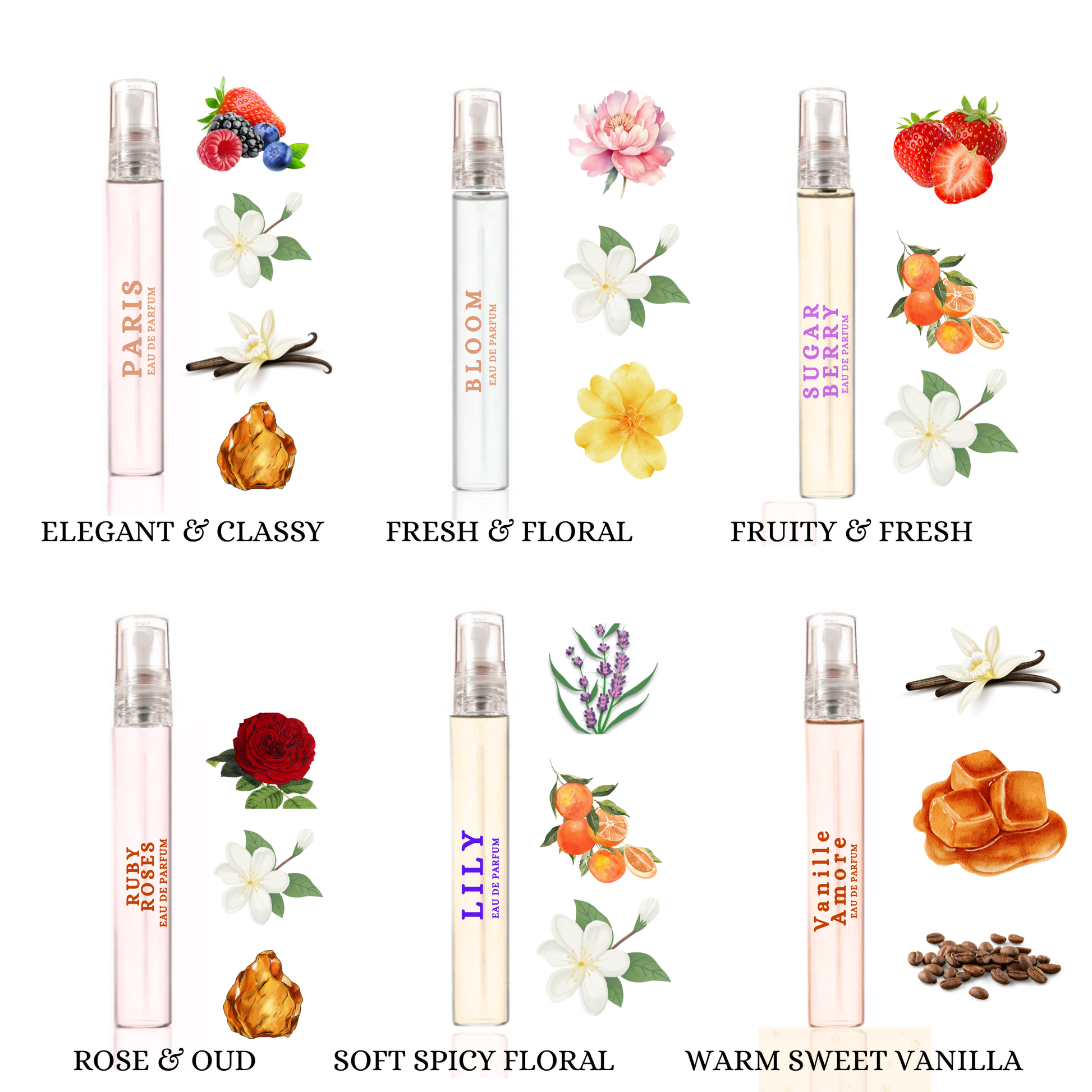 Itari Luxury Women Trial Pack Of 6 X 10Ml Pocket Perfumes Fragrance Mix Of Edp, Edt & Edc Long Lasting Perfume Sweet, Floral, Vanilla, Rose & Musky