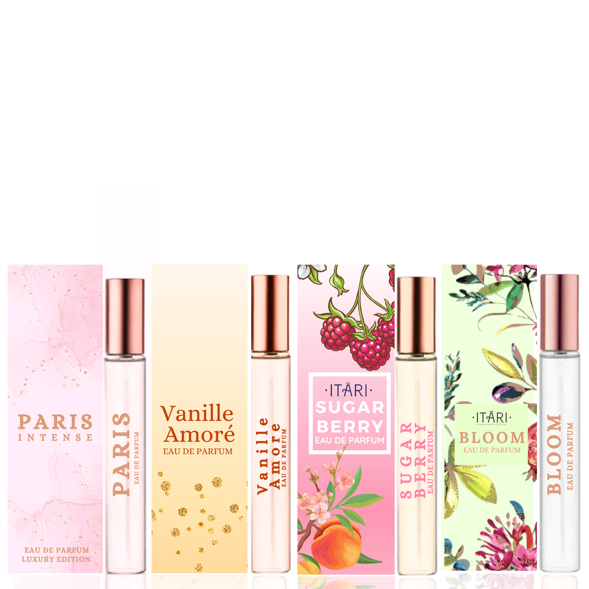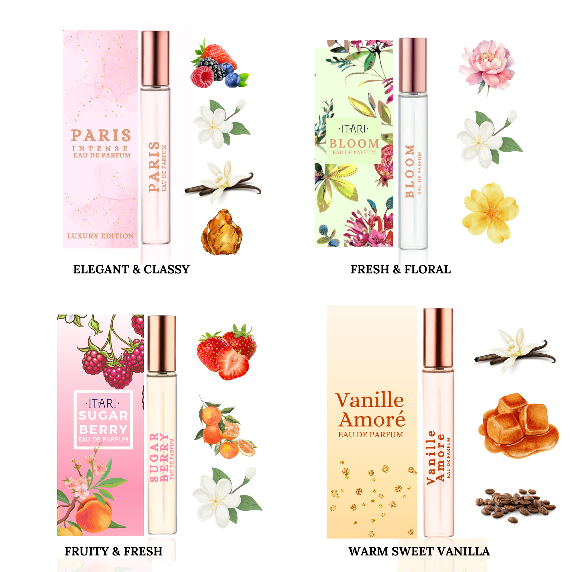 - Variety Pack: This combo set includes 4 different eau de parfum/eau de toilette fragrances for women - Sugar Berry, Bloom, Paris Intense, and Vanille Amoré.