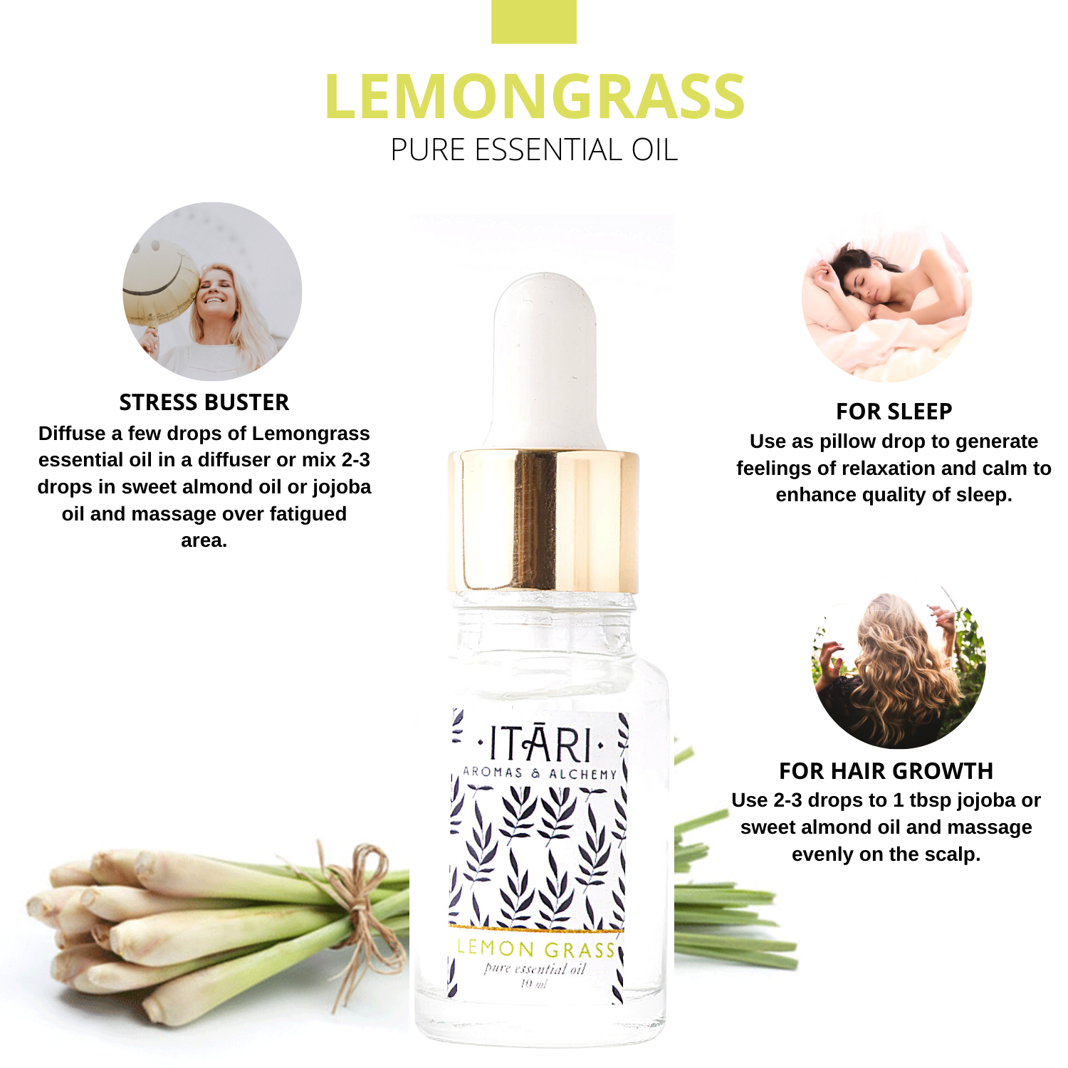 Stress Buster : Diffuse a few drops of Lemongrass essential oil in a diffuser or mix 2-3 drops in sweet almond oil or jojoba oil and massage over fatigued area.